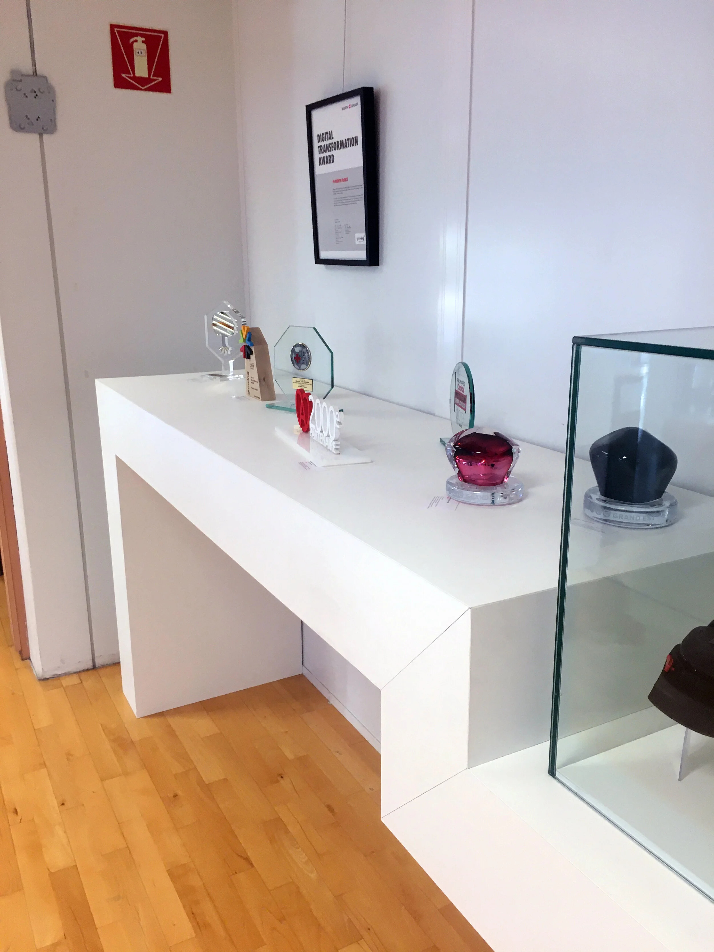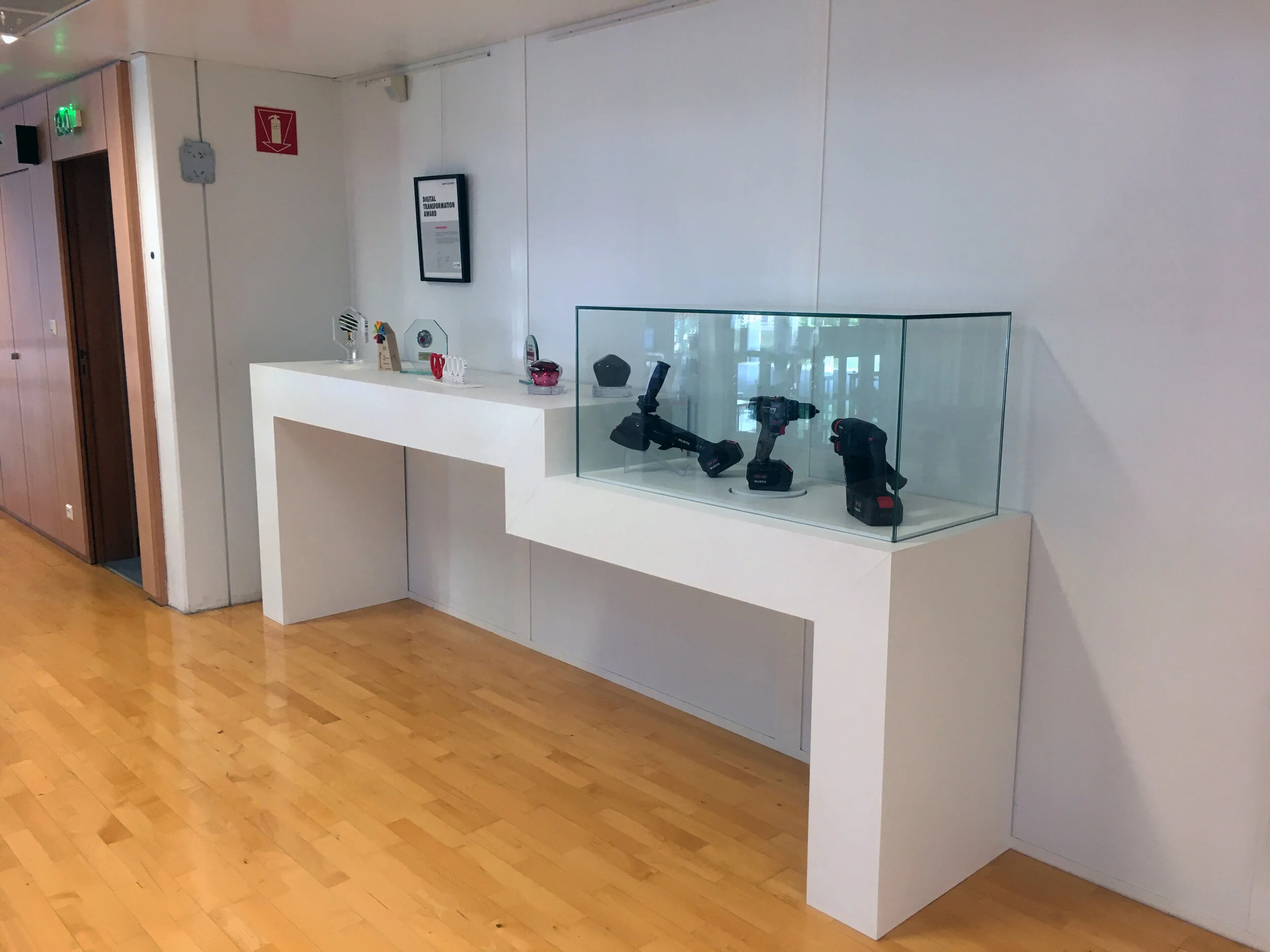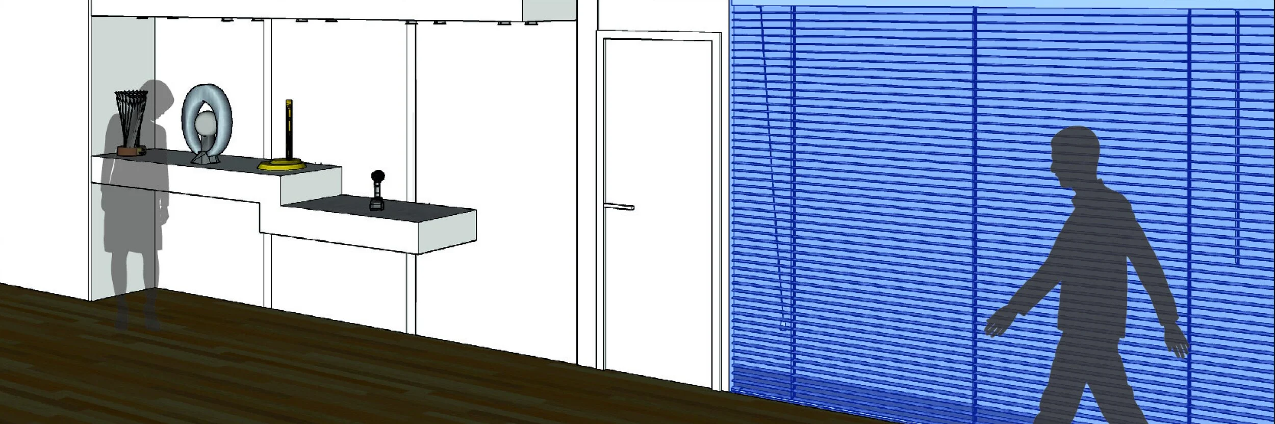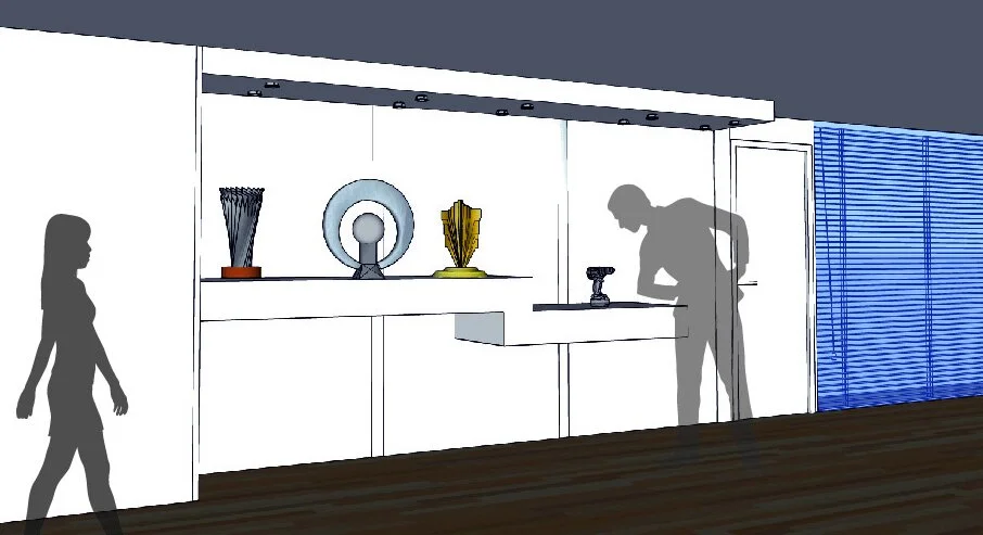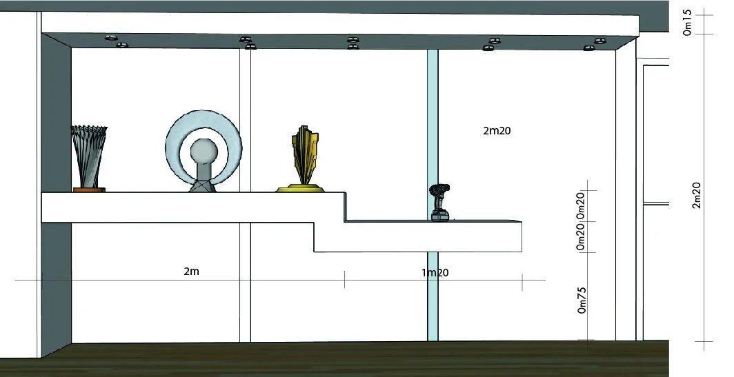 Le projet évolue au fur et à mesure, comme un sablier, on affine la forme et les besoins. Le présentoir devenant mobile, pour servir d’autres espaces et, s’adaptant à son premier espace d’exposition, on prends en compte l’existant (prise électrique, déplacement d’extincteur,…).