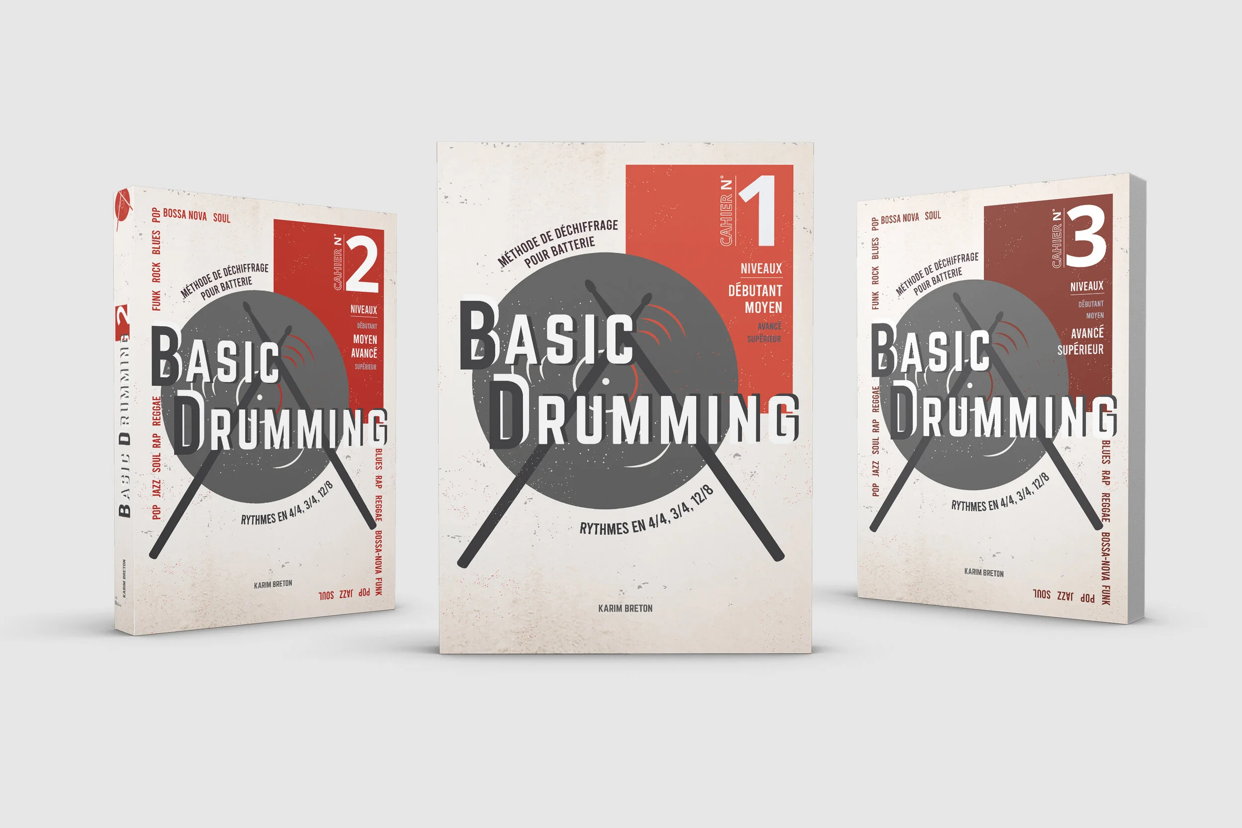 Conception de la couverture d’une méthode de batterie. Composée de 3 livres.